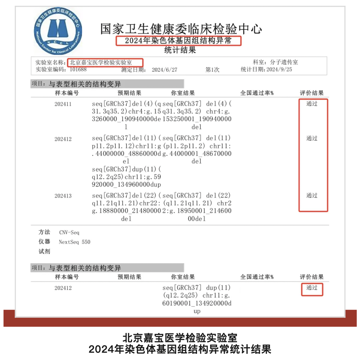 近日,國家衛(wèi)生健康委臨床檢驗中心(NCCL)公布了2024年全國臨床檢驗實驗室室間質(zhì)量評價結(jié)果,嘉寶仁和旗下北京嘉寶醫(yī)學(xué)檢驗實驗室順利通過“染色體基因組結(jié)構(gòu)異常”室間質(zhì)量評價,檢出結(jié)果與預(yù)期結(jié)果一致。這是北京嘉寶醫(yī)學(xué)檢驗實驗室自2019年以來連續(xù)第六年以滿分的成績通過NCCL室間質(zhì)量評價。